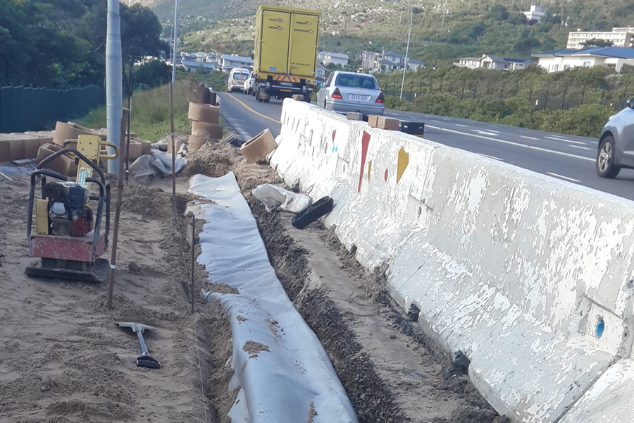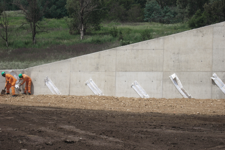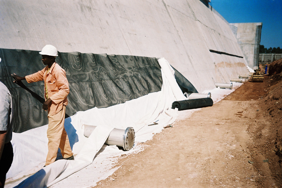 The product can be used in geomembrane liner and capping systems or when used in conjunction with a geotextile and drainage pipe forms the basis of a reliable vertical or horizontal subsoil drainage system or findrain.
